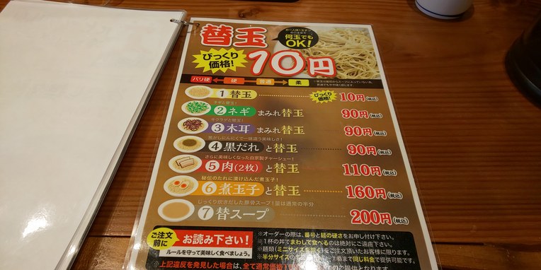 ほとんどのお店では替え玉料金は、100円から150円程度が多い中で10円というのはかなり魅力的です。