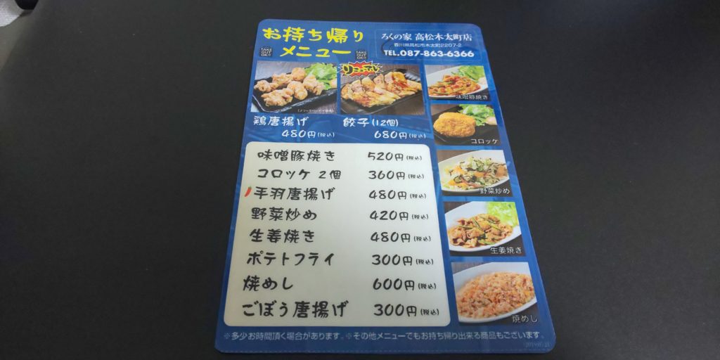 ラーメンはさすがに伸びるのでできませんが揚げ物などを中心にテイクアウトできます。