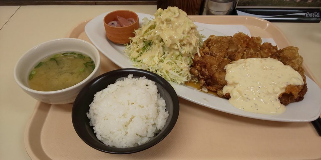 チキン南蛮はからっと揚がって、すごくジューシーです。南蛮たれとタルタルソースとの相性がよくおいしいです。大きく切られたチキン南蛮が5切れありましたが、3切れくらいですでに結構まんぷくでした。小鉢の玉ねぎの酢の物みたいなのがあっさりしているので口の中がすっきりして口直しになります。全体的に味はすごくおいしいですが、やはり量がかなりあるので、私には苦しかったです。