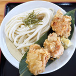 「空海房」さんのおすすめは写真のこの大きな鳥の天ぷらがついた「とり天ざる」です。とり天はジューシーで肉汁があふれ出し、アツアツ揚げたてがいただけます。また、肝心の麺はつやつやと輝くもちもち麺でコシもあり食べ応えがあります。出汁は、少し濃いめで、つけて食べるとのど越しが抜群です。