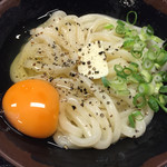 バターと粗挽き黒コショウをのせた釜揚げうどんに生卵としょうゆを少々をかけ、
