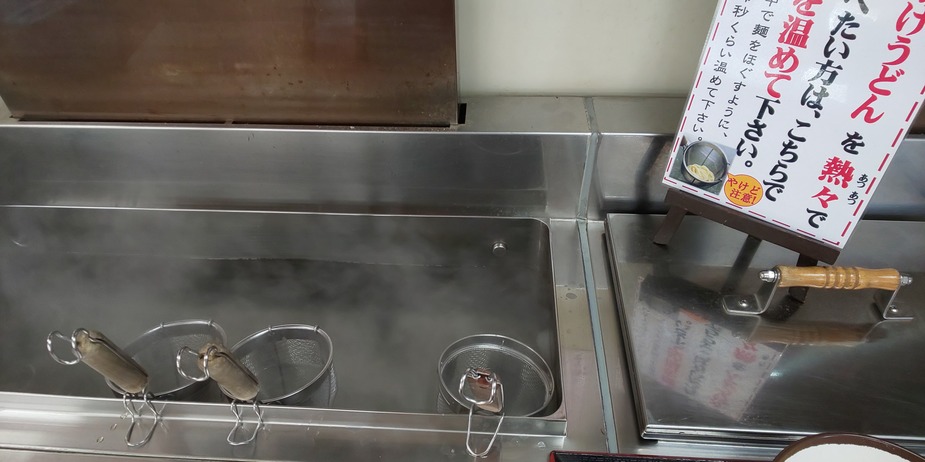 そのあとは、かけうどんの場合、こちらのテボで自分でうどんを温めます。