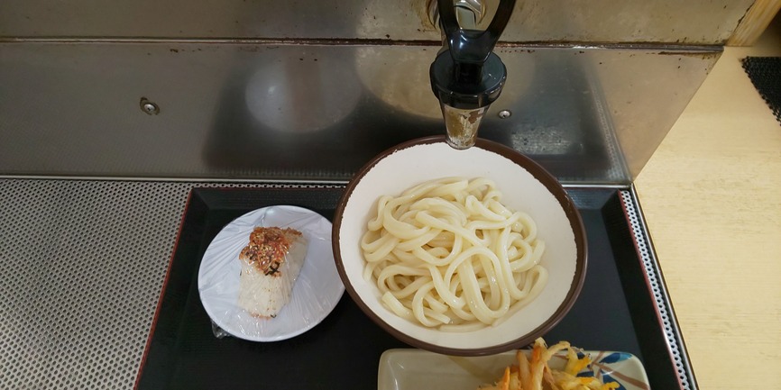 - 本日はかけうどん(中)とかきあげ、おにぎりをいただきました。