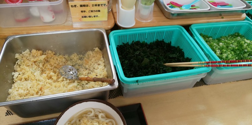 お好みで、天かす、わかめ、ねぎを入れ、席に着きます。