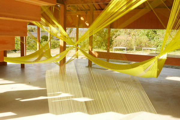 築200年の家屋をリノベーションして制作されたC邸。重厚感のあるギャラリーです。 それらの中に、繊細な黄色い水糸を張り巡らせた現代アート「エーテル」が存在しています。 2階の窓からインサートする光とうまくミックスされて幻想的な雰囲気です。エーテルはハンモックとしても寝ることが可能です。