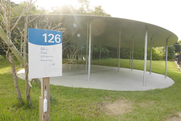 家プロジェクトの休憩所である「中の谷東屋」。円形の屋根の下に、“ラビットチェア”と言われる椅子が並べられています。 椅子に腰を下ろして会話をしたら、声がこだまのように反響しています。 歩き疲れた足をリラックスさせてくれるスポットです