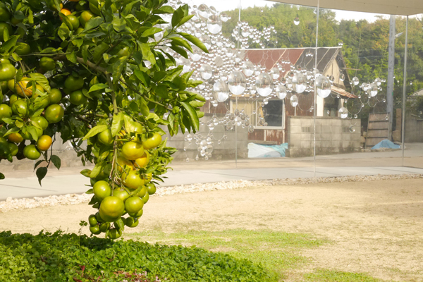 無色透明アクリルの壁が連なっているS邸に設けられたアート作品「コンタクトレンズ」。 いくつもの円形レンズが背景をいろいろな形でカットし、町並みを写真のように現わしています。 一見、ギャラリーというより壁に見られがちですが、よく見るとちゃんと扉を設けています