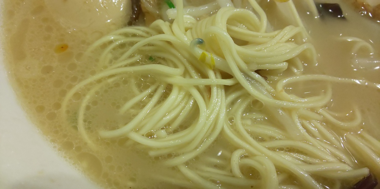 こちらの麺は、極細のストレート麺。ストレート麺が豚骨スープによく合いますね。