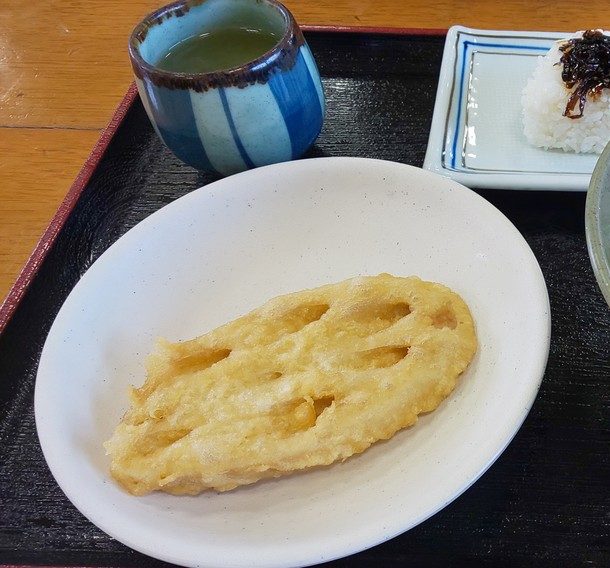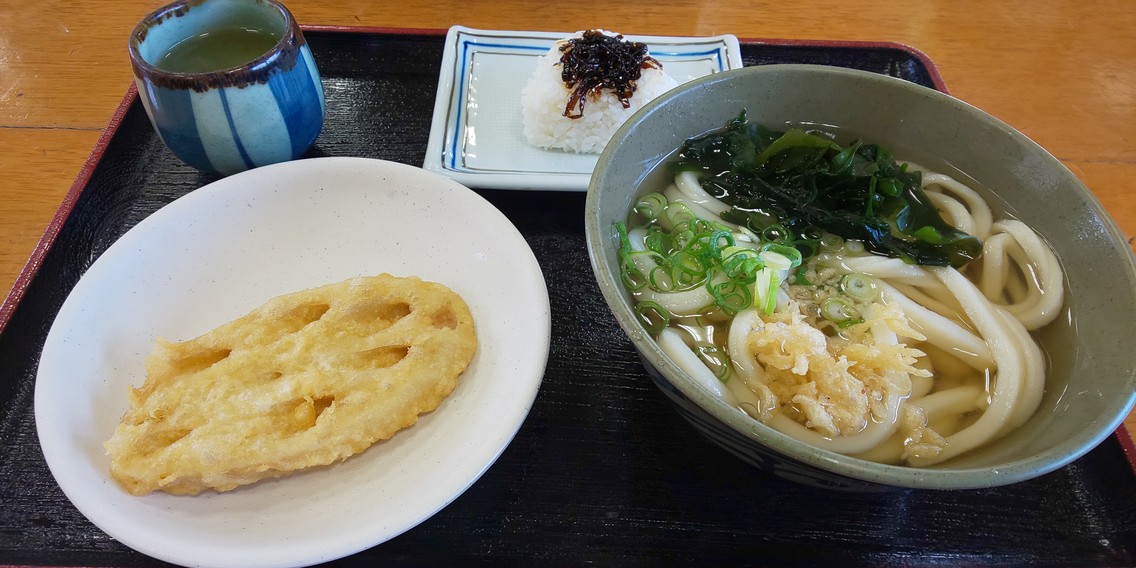 本日は、かけうどん(小)、おにぎり、レンコンの天ぷらを食べました。
