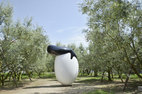 オリーブ畑を歩いていると突然現れる、清水久和による作品です。その名も「オリーブのリーゼント」。島特産のオリーブにも似た白い顔にリーゼントの髪型がなんとも独創的な作品です。インスタ映え間違いなしです。顔の中央にある穴では野菜や果物が並べられ、島の来訪者々に売られています。