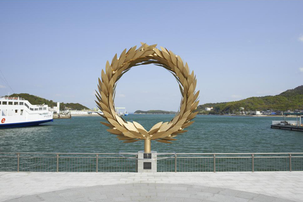 小豆島土庄港の象徴的な現代アート作品。韓国出身の芸術家、チェ・ジョンファと島の子供たちが協力して製作した作品です。オリーブの王冠をかたどった黄金に光り輝く葉の1枚1枚には小学生約100人のメッセージが刻まれています。