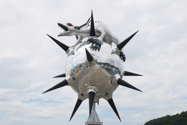 坂手港の灯台跡地に設置された大きな球体作品。ヤノベケンジさんの作品「スター・アンガー」は光り輝く球体の上で、龍が叫ぶ姿は存在感があり、坂手港のシンボルになっています。夜はライトアップされ、ミラーボールみたいに光があっちこっちに反射します。