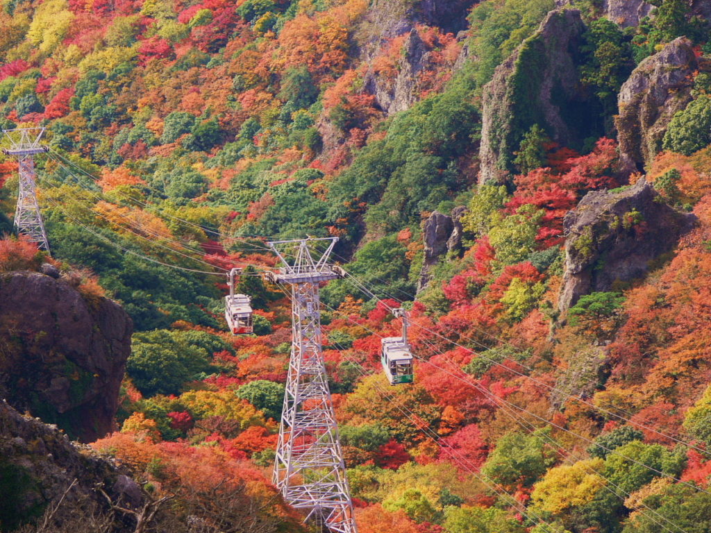 今からおよそ1300万年前に起こった火山活動や、長期間繰り返された地殻変動などで作られた「寒霞渓」は、雄大な自然美が眺められる、国内屈指の景勝地です。車でも行ける山頂の展望台は、瀬戸内海を望む絶景スポット。ロープウェイに乗ると片道約5分の空中散歩の楽しめます。