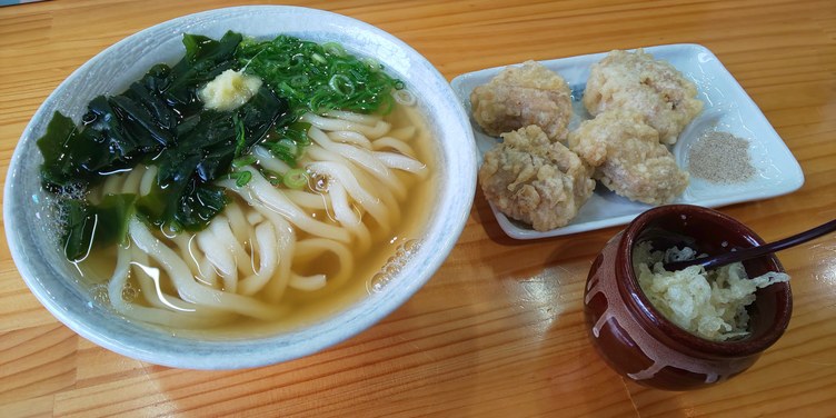 ワカメが添えられた「かけうどん」と、抹茶塩が添えられた「かしわ天」。