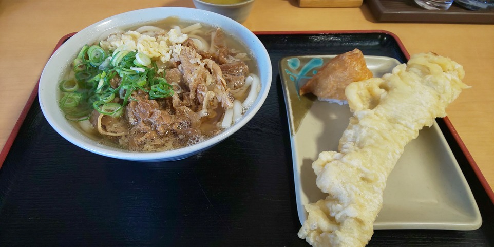 本日は、肉うどんと香川ではあまり見ないかな?アナゴの天ぷらといなりを食べました。