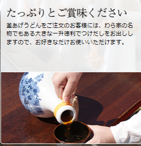 このうどん屋さんは釜揚げうどんのお店です。ざるうどんやぶっかけうどんもありますが、このお店に行くなら釜揚げを食べないと意味がないでしょう(たとえ真夏の暑い日であっても)。釜揚げうどんは茹でたうどんを水で締めずに、そのまま茹で湯と一緒にどんぶりやたらいに移したもので、つけダシにつけて食べます。芯まで熱々の麺から立ち上る香りや、表面にぬめりのある独特の食感が楽しめます。このお店のダシは少し濃いめですが食べていくうちにだんだん薄まってきていい具合になります。