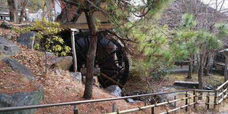 お店は大きな駐車場から石階段を降りていくとまず見えてくるのは大きな水車。