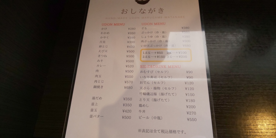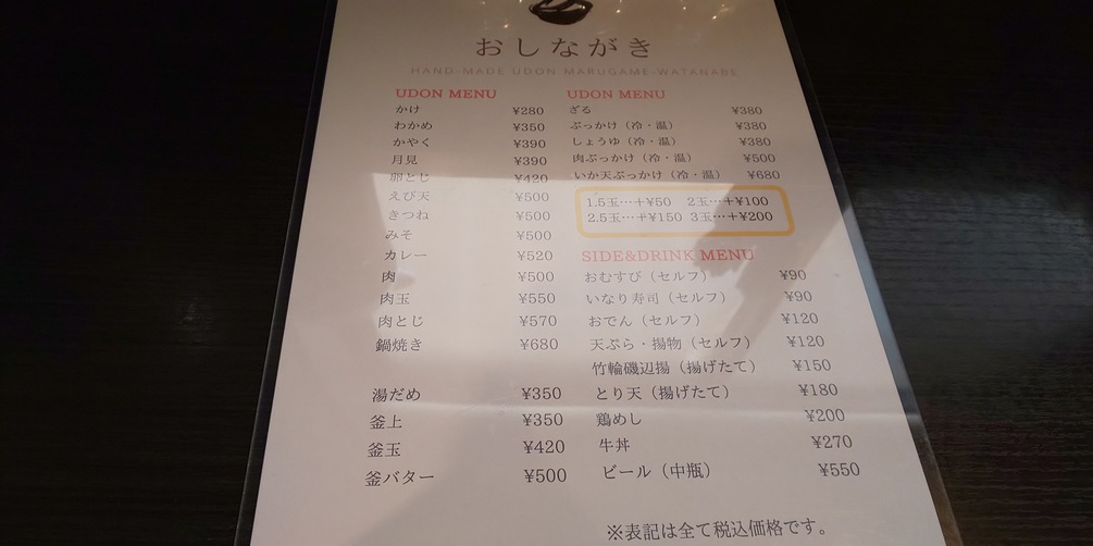 『手打うどん 丸亀渡辺』のメニュー一覧
