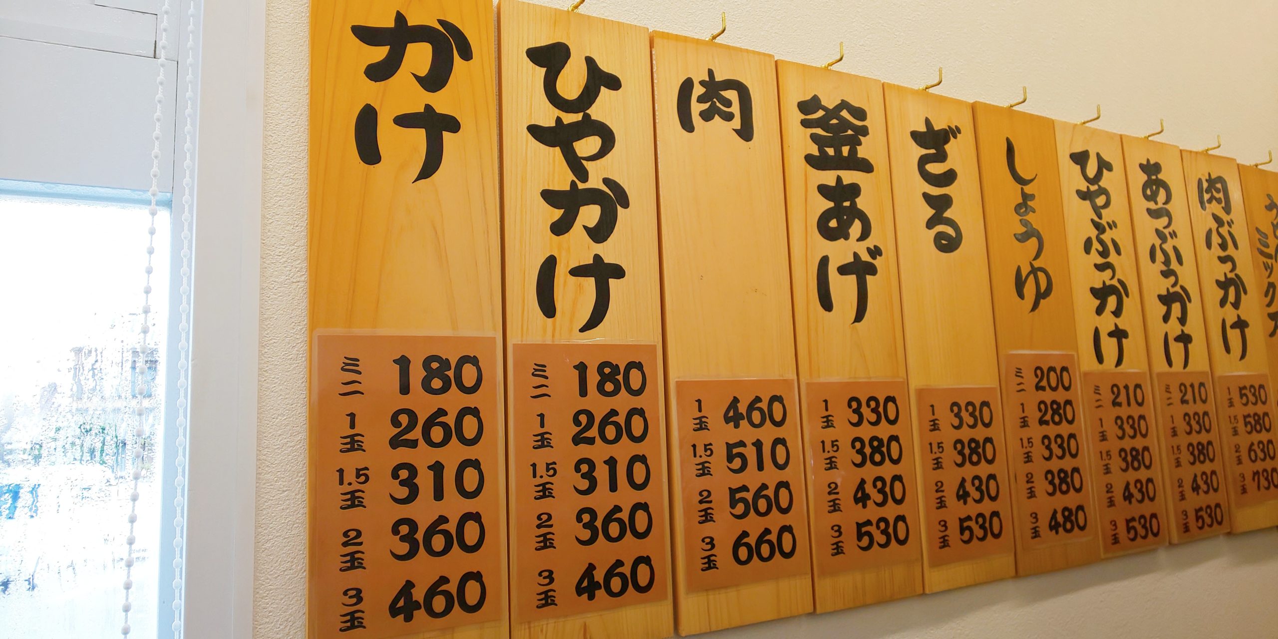 | かけうどん(温・冷) | 180円 | 260円 | 310円 | 360円 | 460円 |