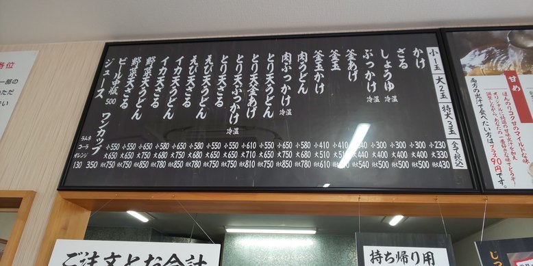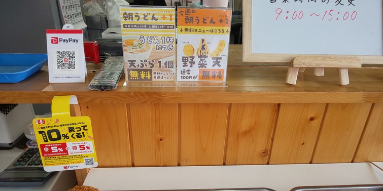 また、朝うどん(平日9:00~11:00、土日祝7:00~11:00)うどん1杯につき天ぷら1つ無料のサービスも