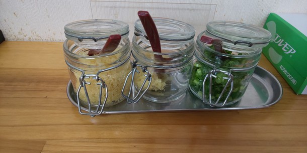 うどんが到着したら、机の上にある薬味を入れて、いただきます。