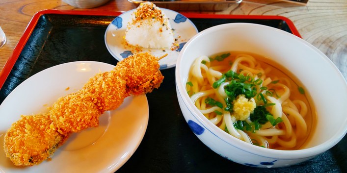 かけうどん、ちくわの天ぷら、香川県産の米で作られた、おにぎり