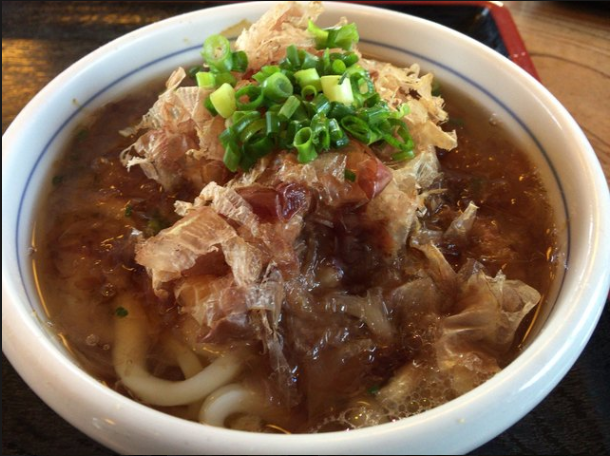 ・「昭和のうどん」と呼ばれるカツオ節、天かす、ネギがたっぷりのかけうどんがある