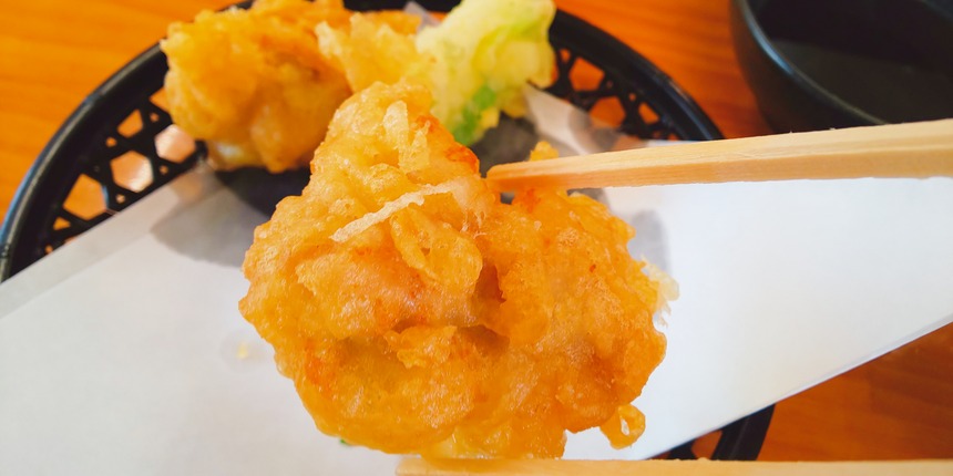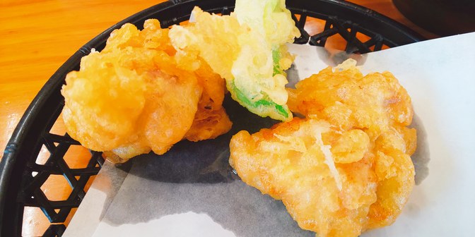 少し大きなかしわ天が2つとピーマンの天ぷらが1つです。