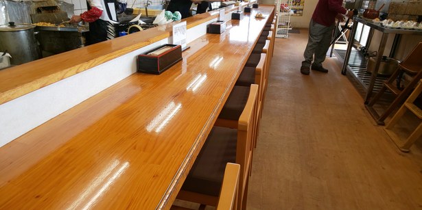 調べても出てこなかったですが、厨房が丸見えのL字型のカウンター席になっています。