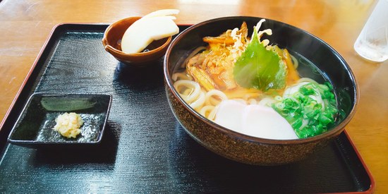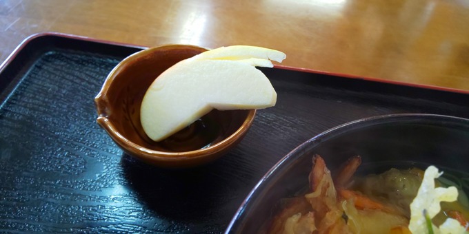 うどんに関しても、少し細めですがおいしいうどんです。また、一緒に提供されたリンゴも美味しくいただきました。小さな心遣いがうれしいですね。